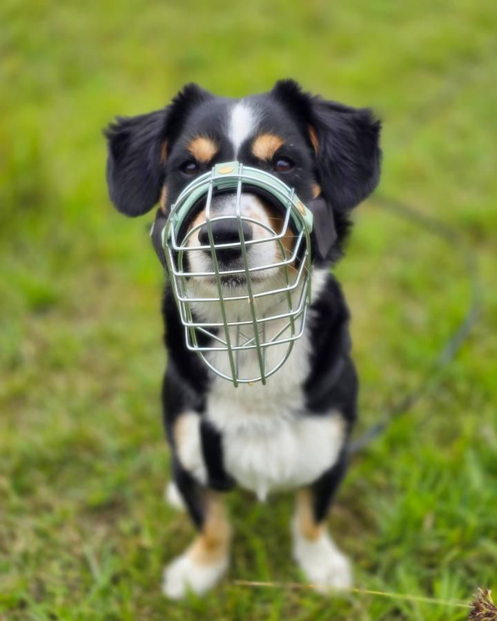 Auch mit dem Maulkorb hat Jacky keinerlei Probleme: Er trägt ihn entspannt, kann aber immer häufiger ohne unterwegs sein. Mit oder ohne Korb kommt er sehr gut zurecht.