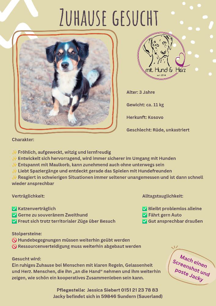 Jacky sucht ein Zuhause bei Menschen, die klare Regeln geben und eine gesunde Portion Gelassenheit mitbringen. Menschen, die ihn „an die Hand“ nehmen, ihm die Welt erklären und ihm Sicherheit schenken. Mit seiner witzigen, liebenswerten Art wird er in den richtigen Händen ein großartiger Begleiter.