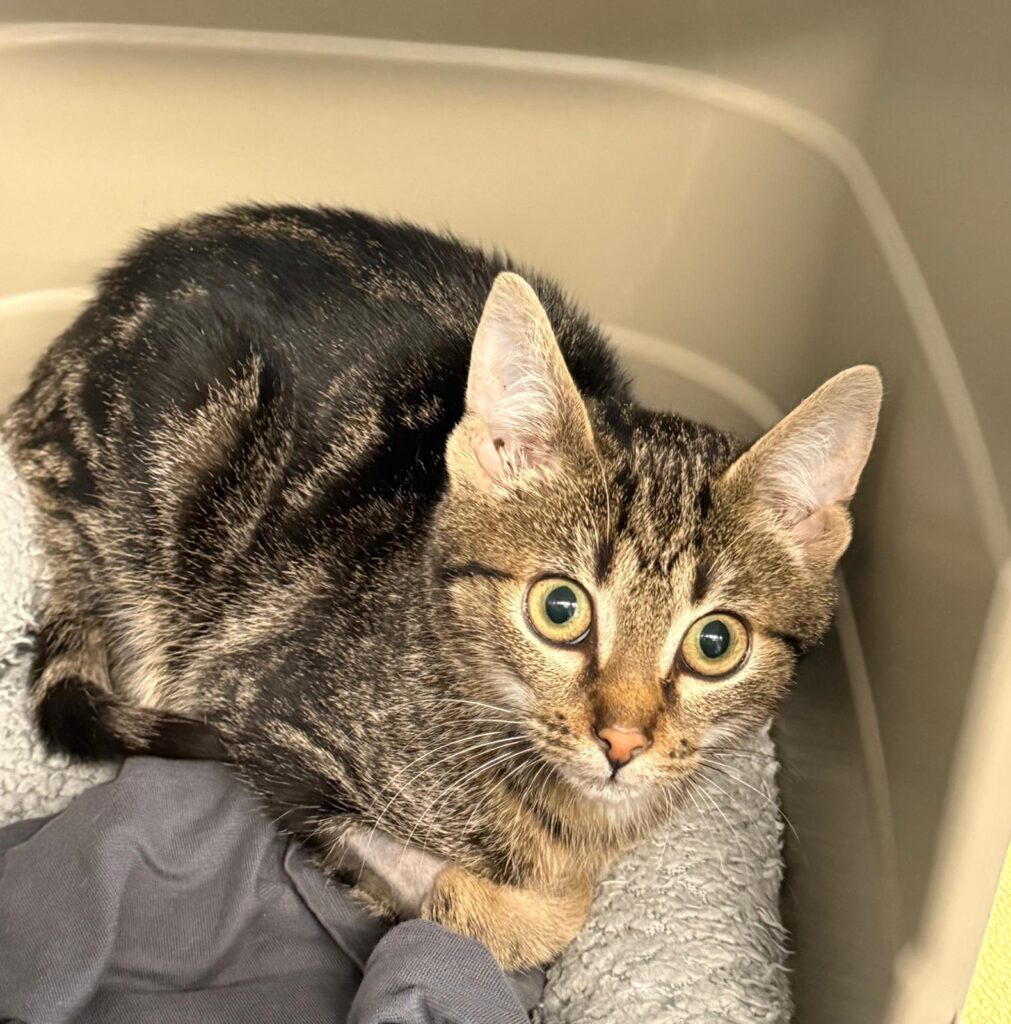 Mittlerweile ist der etwa vier bis fünf Monate alte Kater bei uns im Tierheim und entwickelt sich von Tag zu Tag weiter. Noch ist er etwas schüchtern, aber man merkt, dass seine Neugier größer wird als die Angst – mit Geduld und liebevollem Umgang taut er immer mehr auf.