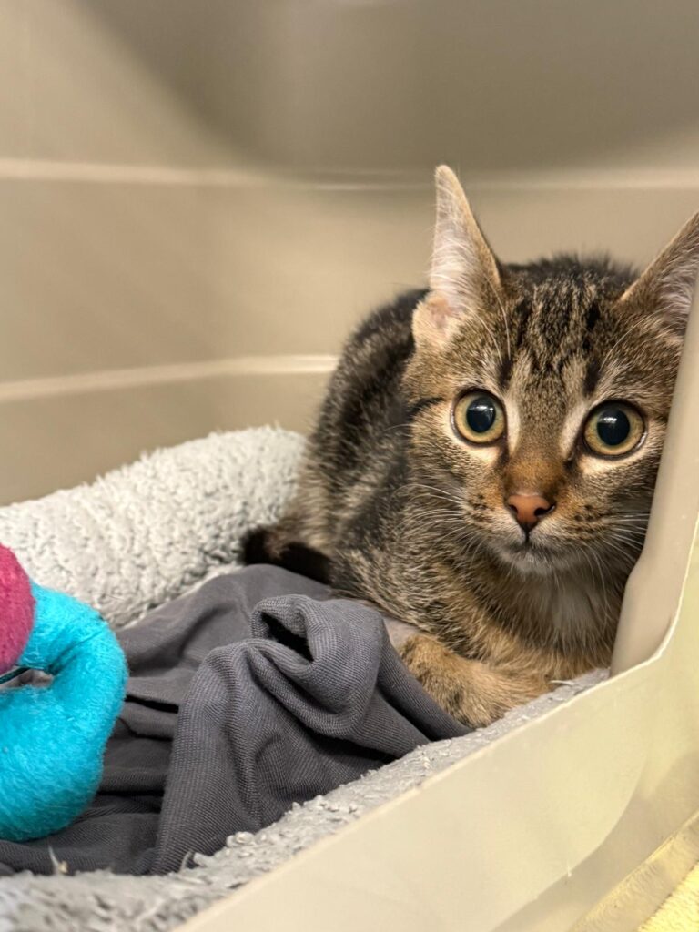 Mittlerweile ist der etwa vier bis fünf Monate alte Kater bei uns im Tierheim und entwickelt sich von Tag zu Tag weiter. Noch ist er etwas schüchtern, aber man merkt, dass seine Neugier größer wird als die Angst – mit Geduld und liebevollem Umgang taut er immer mehr auf.