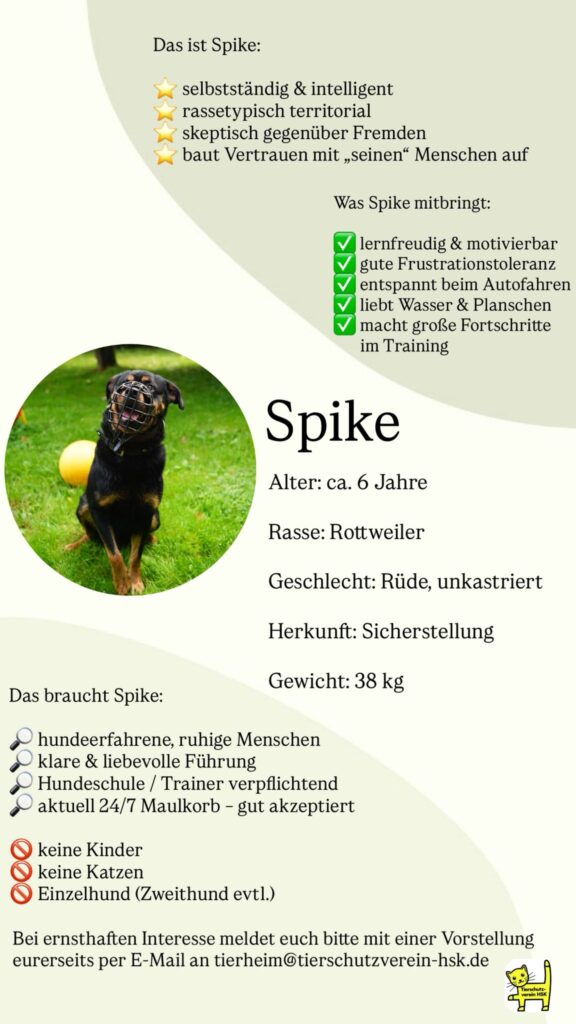 Bei ernsthaftem Interesse meldet euch bitte mit einer Vorstellung eurerseits sowie euren Kontaktdaten per E-Mail an tierheim@tierschutzverein-hsk.de , Spike freut sich schon auf eure Anfragen.