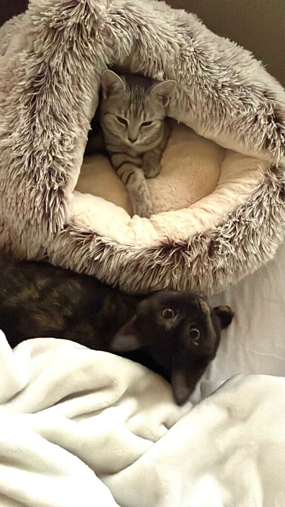Die zwei sind nun schon eine Weile ausgezogen und haben sich super in ihrem neuen Zuhause eingelebt. Kleine Divas sind sie geworden und geben den Ton an. Ein Kissen muss unter den Kopf und es muss gleichzeitig gestreichelt werden. 🙂