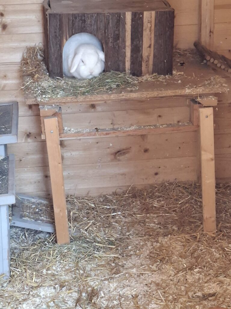 Das übrige Einstreu, Stroh, Futter, Heu und die Näpfe würden bei der Vermittlung mitgegeben.